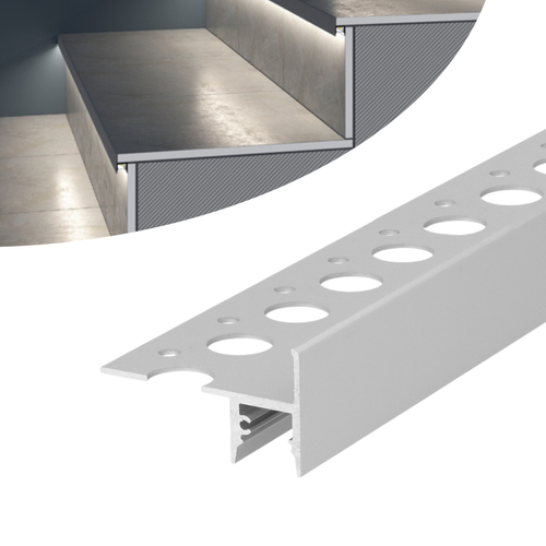 Podpłytkowy profil schodowy, który wyposażony w dobrze dobraną taśmę LED zapewni nie tylko odpowiednią ilość światła, ale również umożliwi estetyczne wykończenie krawędzi stopni. Eleganckie wykończenie profilu z gładką powierzchnią od przodu pasuje do wnętrz o różnym charakterze. Listwa LED posiada otwory montażowe, które umożliwiają łatwy montaż w płytkach przy użyciu kleju montażowego.