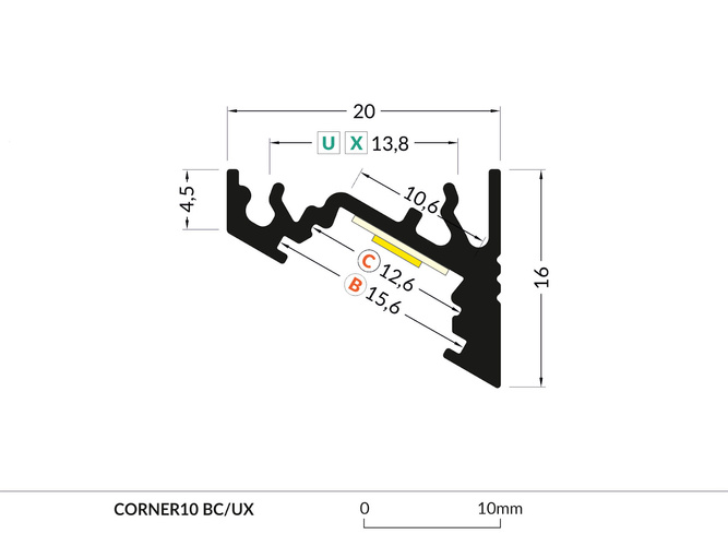 Zalecamy montaż profilu LED CORNER10 za pomocą dedykowanych uchwytów sprężystych „U" („U cone”, które umożliwi licowanie profilu z powierzchnią montażową lub z delikatnym dystansem „U”) oraz uchwytów „X".