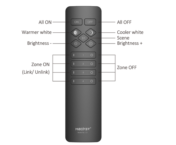 Pilot MiBoxer C1 do sterowania oświetleniem LED w technologii MONO (jednokolorowej) oraz CCT (zmienna temperatura barwowa – ciepła/biała/zimna).
