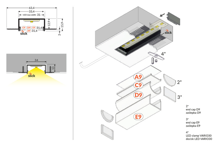 Dobór zaślepek uzależniony jest od klosza, który dobierzemy do profilu. Zamawiając profil z kloszem A9 lub C9 wystarczy zakup samej zaślepki VARIO30-04 w odpowiednim kolorze. Wybierając klosz E9 należy zamówić zaślepkę VARIO30-04 + zaślepkę E9. Wybierając klosz D9 należy zamówić zaślepkę VARIO30-04 + zaślepkę D9.