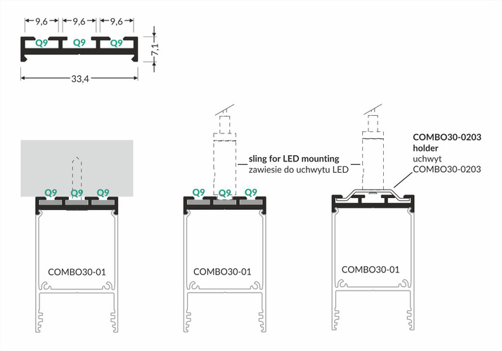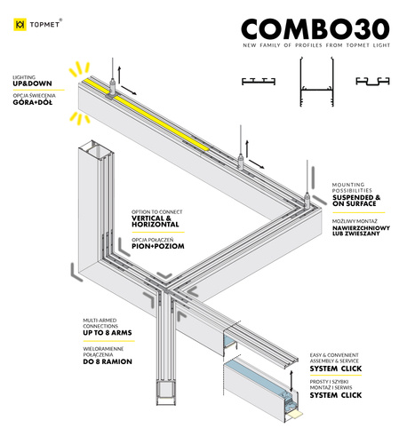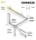 COMBO30 to system składający się z 3 profili aluminiowych i wielu akcesoriów. Daje elastyczność w tworzeniu rozbudowanego oświetlenia. Cechą charakterystyczną rodziny COMBO30 jest możliwość tworzenia stabilnych połączeń wieloramiennych (do 8 ramion wychodzących z jednego punktu łączenia). Dostępne łączniki kątowe: 45st, 60st, 90st, 120st, 135st, 180st. Dodatkowo jest możliwość tworzenia połączeń pion-poziom za pomocą osobnego łącznika 90st. Dzięki możliwości wypięcia profilu wraz ze źródłem LED i zasilaczem z całości oprawy, montaż i serwis jest prosty i wygodny.