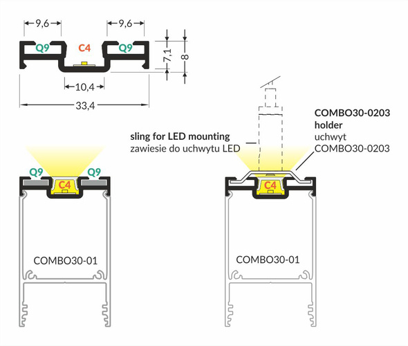 COMBO30-03 daje w połączeniu z profilem COMBO30-01 możliwość tworzenia opraw oświetleniowych świecących w dół i w górę jednocześnie. Dla profilu COMBO30-01 – maksymalna szerokość źródła LED wynosi 30mm, natomiast dla profilu COMBO30-03 szerokość taśmy LED to 10mm.