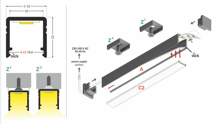Zalecamy montaż profilu LED SMART10 za pomocą dedykowanych uchwytów sprężystych "Z" („Z cone”, które umożliwi licowanie profilu z powierzchnią montażową lub z delikatnym dystansem „Z”).