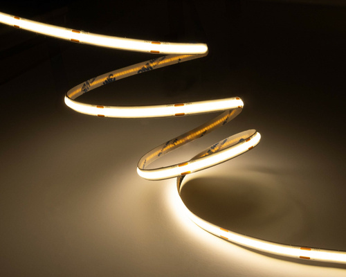 Taśmy LED COB mają bardzo gęsto rozstawione diody LED które dodatkowo są pokryte podłużną warstwą luminoforu, dzięki czemu uzyskujemy piękną, jednolitą linię światła.