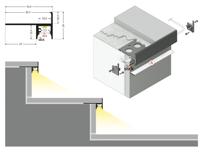 Podpłytkowy profil schodowy, który wyposażony w dobrze dobraną taśmę LED zapewni nie tylko odpowiednią ilość światła, ale również umożliwi estetyczne wykończenie krawędzi stopni. Eleganckie wykończenie profilu z gładką powierzchnią od przodu pasuje do wnętrz o różnym charakterze. Listwa LED posiada otwory montażowe, które umożliwiają łatwy montaż w płytkach przy użyciu kleju montażowego.