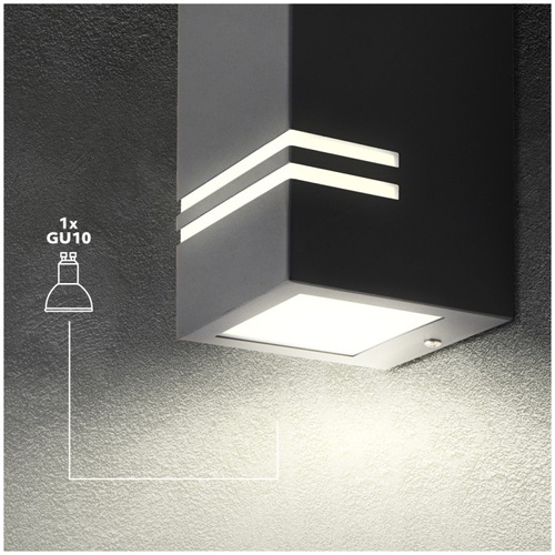 Nowoczesny kinkiet ścienny o jednokierunkowym strumieniu światła. Wykonany z trwałego aluminium oraz tworzywa sztucznego, idealnie sprawdzi się na elewacjach domów, tarasach czy przy wejściach.