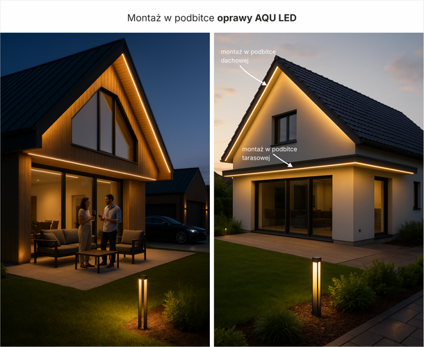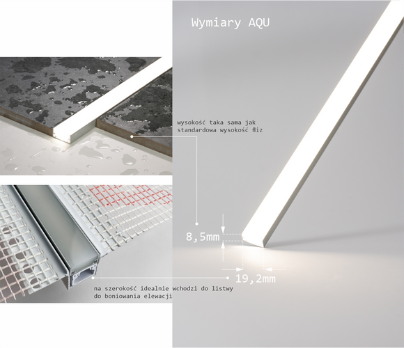 Oprawa LED AQU to gotowe rozwiązanie do tworzenia dekoracyjnych linii świetlnych w miejscach narażonych na wilgoć i kontakt z wodą. Dzięki pełnemu zalaniu żywicą jest całkowicie wodoszczelna (IP68) i odporna na promieniowanie UV oraz nacisk (IK08).