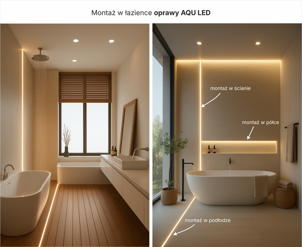 Oprawa LED AQU to gotowe rozwiązanie do tworzenia dekoracyjnych linii świetlnych w miejscach narażonych na wilgoć i kontakt z wodą. Dzięki pełnemu zalaniu żywicą jest całkowicie wodoszczelna (IP68) i odporna na promieniowanie UV oraz nacisk (IK08).