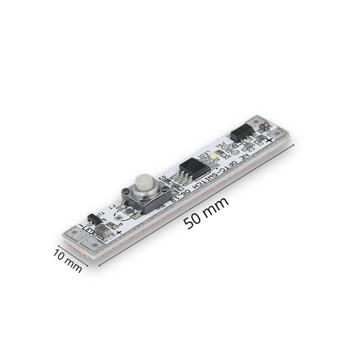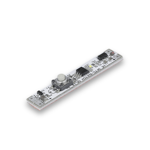 Włącznik LED montowany w profilu aluminiowym, przeznaczony do taśm LED 12–24V. Maksymalne obciążenie: 60W (12V) lub 72W (24V). Posiada funkcję ściemniania – wystarczy przytrzymać przycisk, aby płynnie regulować jasność oświetlenia. Idealny do zastosowań meblowych.