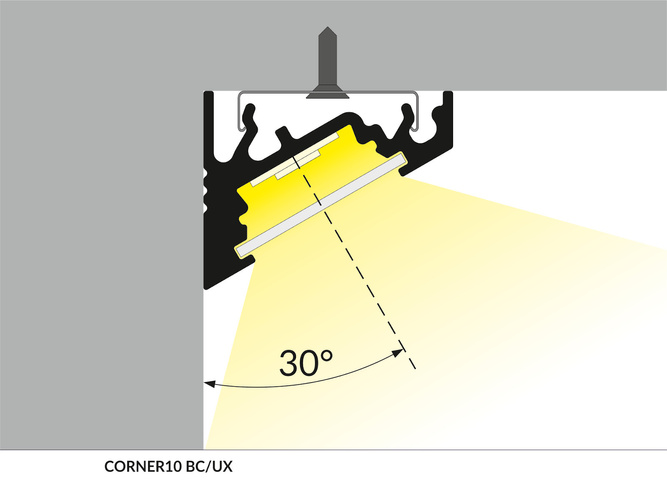 Zalecamy montaż profilu LED CORNER10 za pomocą dedykowanych uchwytów sprężystych „U" („U cone”, które umożliwi licowanie profilu z powierzchnią montażową lub z delikatnym dystansem „U”) oraz uchwytów „X".