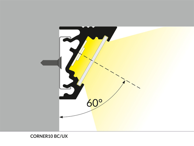Zalecamy montaż profilu LED CORNER10 za pomocą dedykowanych uchwytów sprężystych „U" („U cone”, które umożliwi licowanie profilu z powierzchnią montażową lub z delikatnym dystansem „U”) oraz uchwytów  „X".