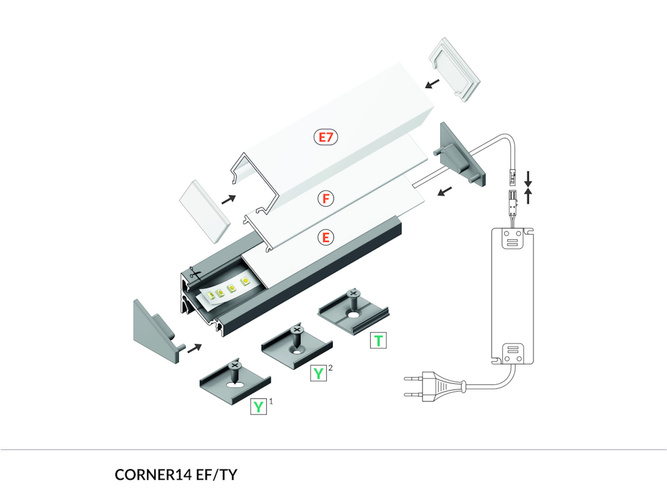 Zalecamy montaż profilu LED CORNER14 za pomocą dedykowanych uchwytów sprężystych „Y”. („Y” cone”, które umożliwią licowanie profilu z powierzchnią montażową bądź z delikatnym dystansem „Y”) lub sztywnych uchwytów „T”. Profil może zostać także zamontowany za pomocą wkrętów, kleju montażowego, bądź dobrej jakości taśmy dwustronnej.